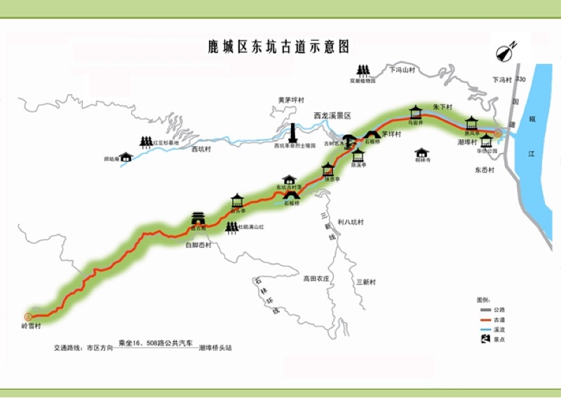 东坑古道,位于鹿城区藤桥镇双潮社区,接壤一县二区,起始于瓯海区泽雅镇岭雪村,横跨白脚坳村、东坑村、茅垟村、朱下村、荫溪潮埠村,直抵瓯江,是鹿城区西部最长的一条古道。全长约10.2公里,宽1.2米,呈东北西南走向,最高海拔644米。古道由条石、夯土、卵石铺成。古道边,山林苍翠茂盛,林荫夹道,郁郁葱葱,时闻流水潺潺、鸟语花香。