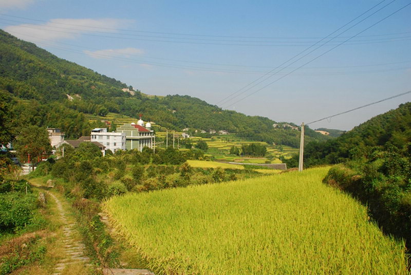 溪两边的梯田十分漂亮。一条宽宽的古道顺着田埂随意而又恰当地在田间蜿蜒。潺潺的溪水,还有对面竹林的深绿和远山的青黛色,构成了一幅壮美的田园画卷。