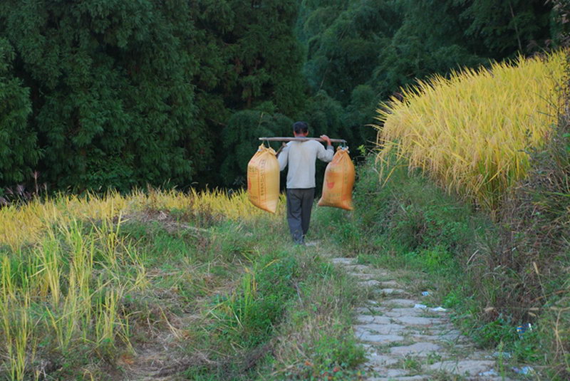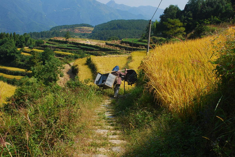 沿着水泥公路,下坡走一小段路,在左侧又见下坡老路。当地人称此岭为“大脑头岭”,岭两侧是金黄色的梯田,梯田下是潺潺的西岸溪,远处是满山翠绿的竹林,竹林间零星点缀着几间青瓦老房。这样的田园风光,在泽雅随处可见。